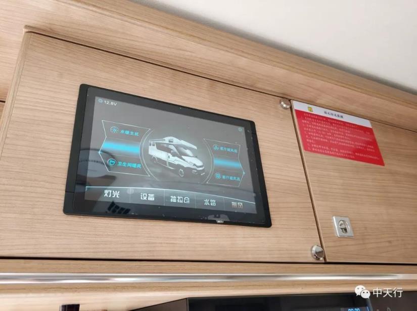 錢先生熱情的邀請我們上車參觀,邊講解房車內(nèi)部各功能邊操作,打開倆拓展倉后內(nèi)飾空間寬敞,錢先生說他喜歡總控操作是觸摸屏的,智能化人性化易操作。