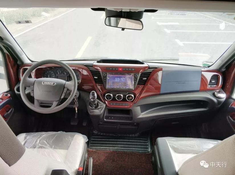 駕駛室延續(xù)了凱倫賓威經(jīng)典的改裝風(fēng)格,酒紅色木飾搭配黑色中控,米白色搭配灰色皮質(zhì)座椅,中控部分安裝了超大的液晶顯示屏,具備導(dǎo)航、倒車影像及影音系統(tǒng)等功能,配色大氣,功能實用。