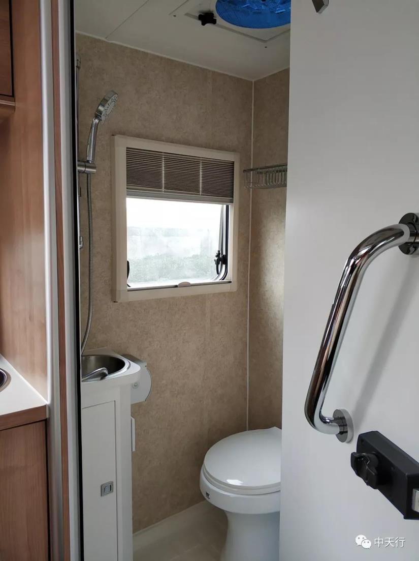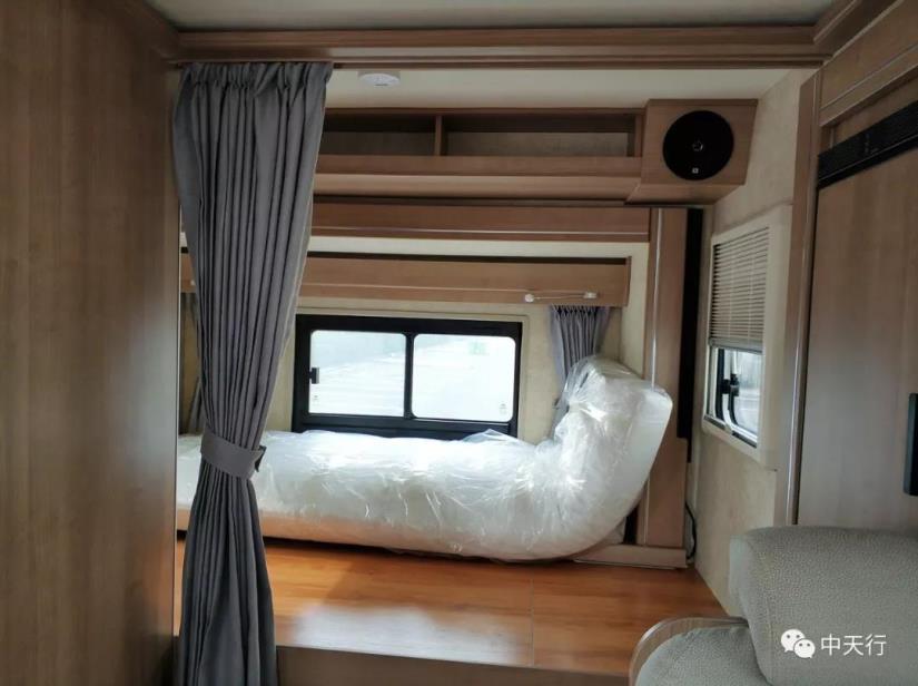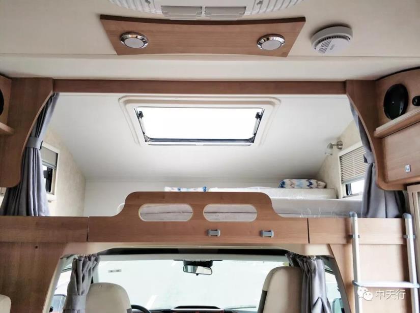 駕駛室上方為額頭雙人床,可通過扶梯上下,不用時扶梯可收起。額頭床三面帶窗,采光充足,感覺寬敞不壓抑。床向上推起是一個大屏液晶電視,可坐在客廳觀看。