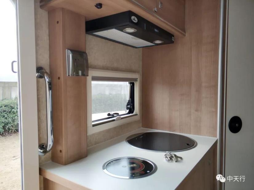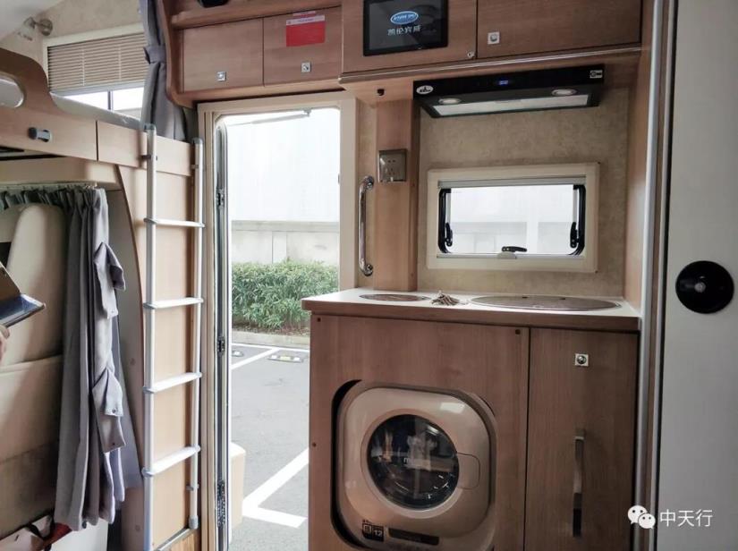 車廂中部為廚房區(qū)域和雙人卡座沙發(fā),一體式廚房位于車身右側(cè),抽油煙機、電磁爐、帶蓋洗菜池、儲物柜等配置一應(yīng)俱全,櫥柜下方還按照錢先生要求搭配了滾筒式洗衣機。