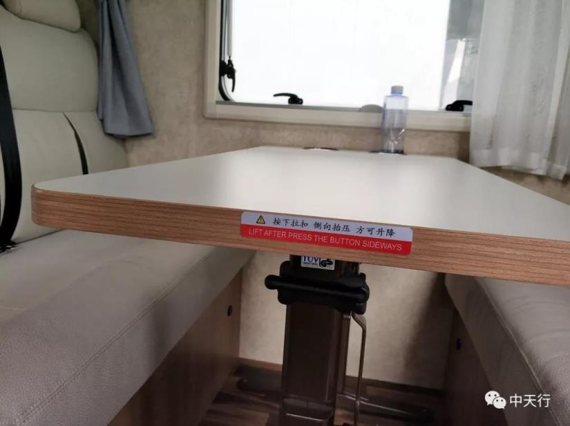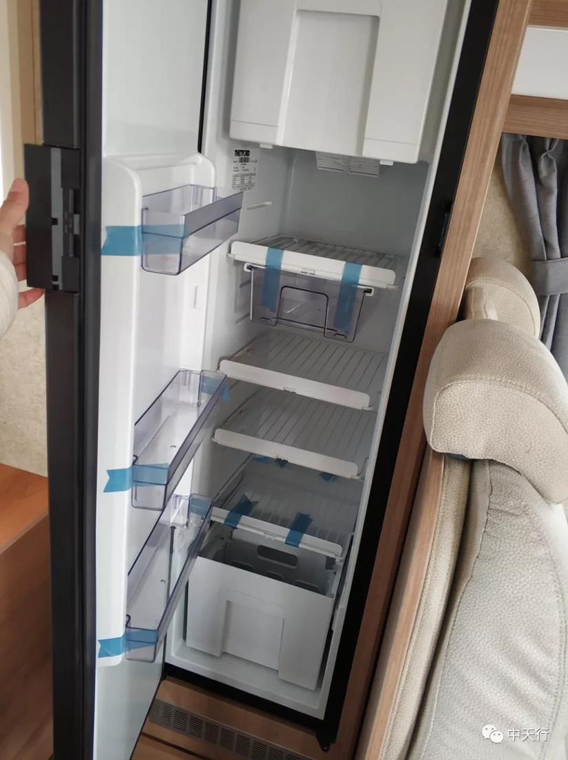 會客區(qū)可同時乘坐四人,中部的升降桌放下后可拼成單人床。房車專用冰箱安裝在卡座沙發(fā)后邊,帶冷藏功能。