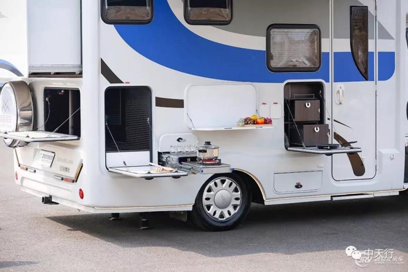 考慮到用戶真正的需求,車身右側(cè)設(shè)置了外置廚房。車尾和車身右側(cè)的行李艙為貫通式設(shè)計(jì),儲(chǔ)物艙艙門打開為一個(gè)操作平臺(tái),隱藏在車身壁板之內(nèi)還有一塊板,打開也是一個(gè)操作臺(tái),靠近乘客門的位置還設(shè)計(jì)有一個(gè)集成度非常高的外置櫥柜,也就是說(shuō)這款車在戶外做飯有可以大量應(yīng)用的操作平臺(tái)可用。