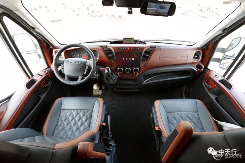 駕駛室在進(jìn)口依維柯底盤基礎(chǔ)上對(duì)細(xì)節(jié)做了裝飾,左右車門的門板扶手以及中控整個(gè)面板都采用了仿桃木飾板裝飾。駕駛室內(nèi)配備了一塊10.5寸觸控屏,支持導(dǎo)航、收音機(jī)、播放視頻音頻、手機(jī)藍(lán)牙及多個(gè)APP功能。駕駛室的減震座椅采用真皮包覆,保證用戶乘坐的舒適性。駕駛室后視鏡內(nèi)集成有四路監(jiān)控系統(tǒng),進(jìn)一步提升行車安全。
