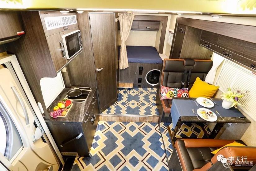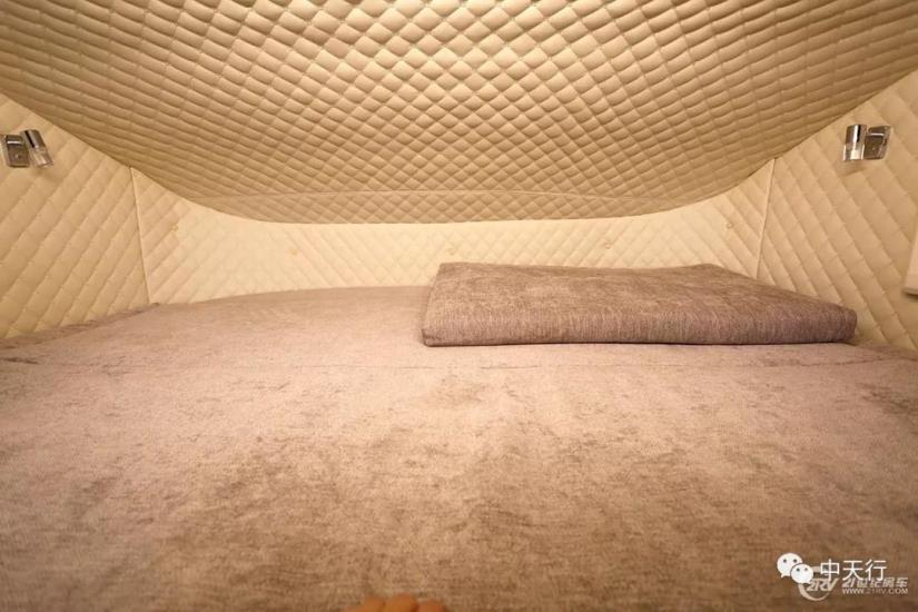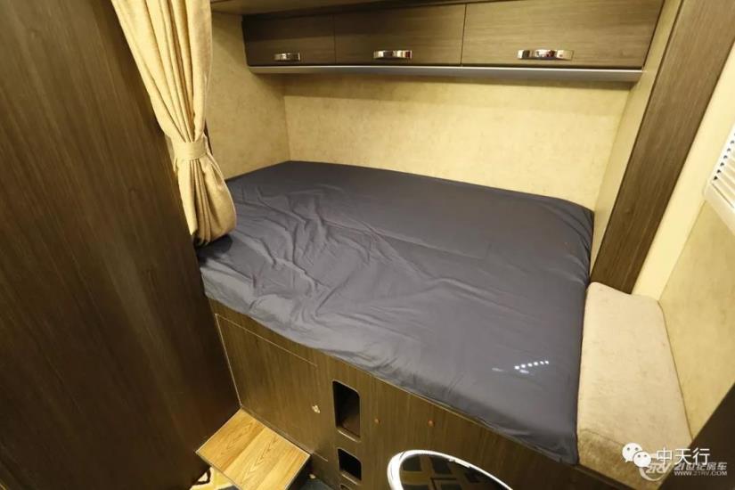 駕駛室上方為2180×1500(mm)的雙人床,廂體壁板依然是菱形的軟包處理,新車車頂并未開設(shè)天窗,保留了左右各一扇側(cè)窗。