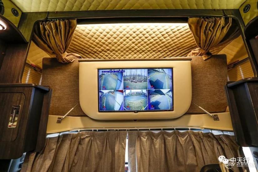 額頭床向上翻折即可看到32寸智能電視,6路監(jiān)控系統(tǒng)也植入到了電視之內(nèi),大屏幕可以直觀的看到車身前后左右以及側(cè)方360度無(wú)死角的影像。
