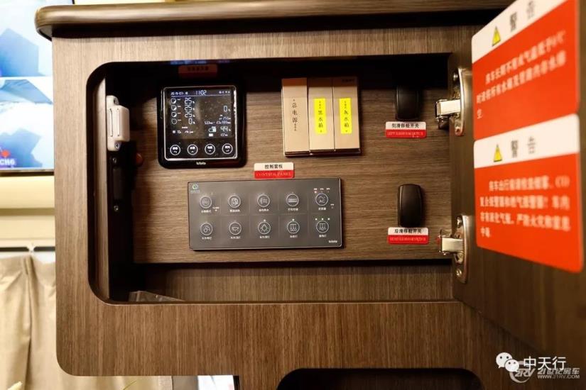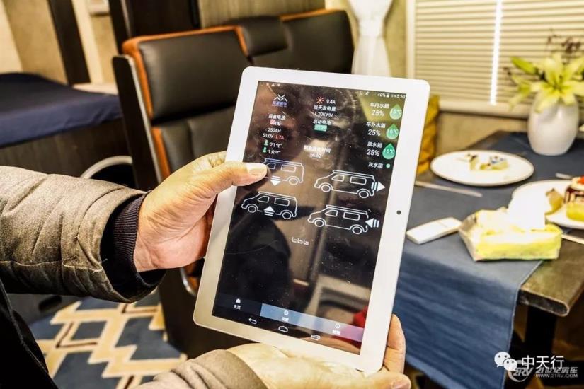 除實(shí)體按鍵以外,該車還增配了房車智能APP控制系統(tǒng)及智能家居系統(tǒng),通過(guò)車內(nèi)的Pad直接控制車內(nèi)的設(shè)備,還能清晰的觀察車內(nèi)設(shè)備運(yùn)行的情況,包括燈光開關(guān),凈水箱、灰水箱余量,電池電量,太陽(yáng)能電池板充電的電量以及影音系統(tǒng)等等。