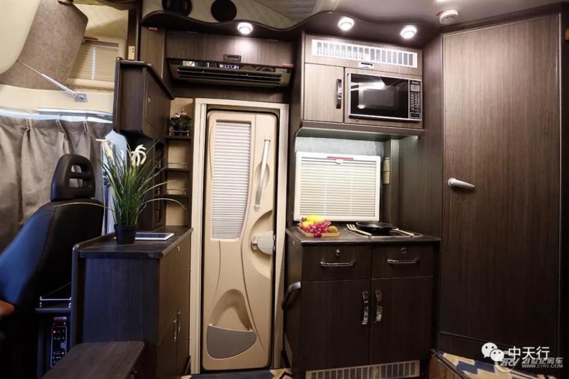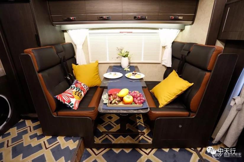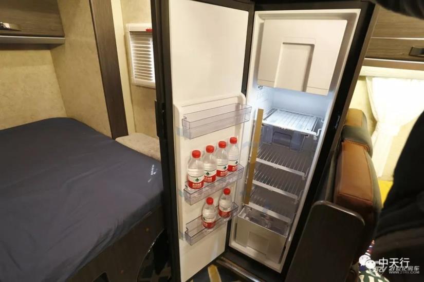 卡座沙發(fā)后方是一臺(tái)152升進(jìn)口賽特福德冰箱,含18L冷凍柜,134L冷藏室。冰箱整體機(jī)身外尺寸為1500 x 418 x 578(mm),高效利用車內(nèi)空間,使整體空間更寬敞舒適。