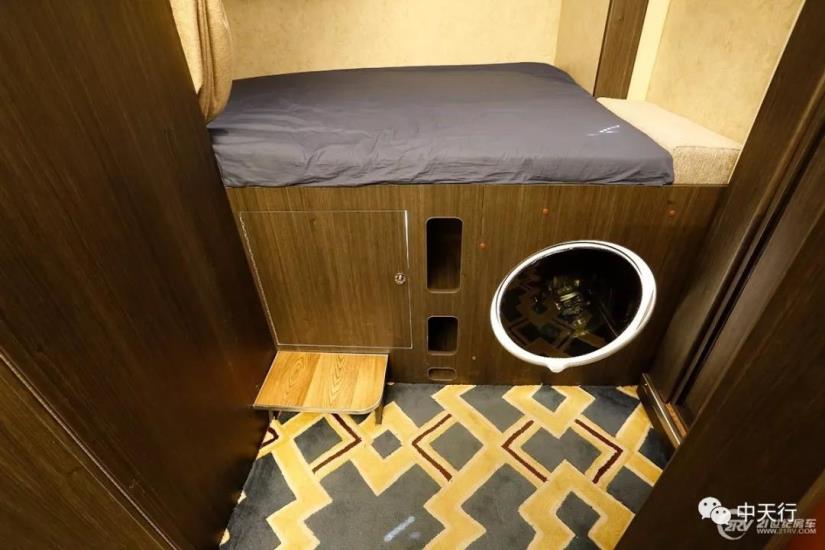 車尾床之內(nèi)是一臺(tái)嵌入式的韓國(guó)大宇迷你洗衣機(jī),帶烘干功能,前面我們?cè)诮榻B外觀的時(shí)候介紹到過(guò)后面儲(chǔ)物倉(cāng)內(nèi)的洗衣機(jī)調(diào)溫閥,正好對(duì)應(yīng)的是這款洗衣機(jī)。為了方便老人或者是小孩上到后床,還設(shè)計(jì)有一個(gè)小踏步。