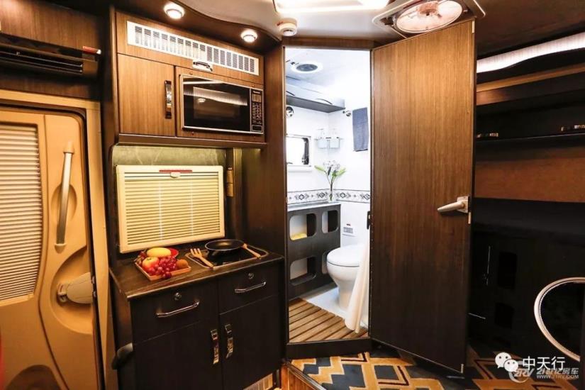 車廂中部為廚房和會(huì)客區(qū)域,廚房區(qū)使用了仿黑色花崗巖桌面,搭配木紋櫥柜頗有居家感。桌面上配備有帶蓋板洗菜池,但未配備電磁爐。櫥柜內(nèi)的獨(dú)立抽屜為多用型,外置廚房可用,內(nèi)置廚房也可以用,雙向抽拉式。操作臺(tái)還可以進(jìn)行延展,打開鎖止按鈕,可以打開一個(gè)延伸的臺(tái)面。此外,還配有微波爐、儲(chǔ)物柜、帶USB口的插座等。