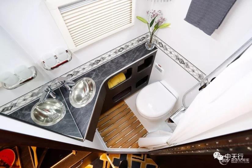 廚房與車尾床之間是衛(wèi)生間區(qū)域,毛巾架,洗漱臺(tái),晾衣繩,側(cè)窗,杯架,獨(dú)立的淋浴系統(tǒng),頂置雙氣流換氣扇等配置齊全。仿大理石洗手池桌面、木質(zhì)淋浴地板及淺色紋理內(nèi)墻使得衛(wèi)生間在外觀上更具層次感,同時(shí)衛(wèi)生間還配備了一款塞特福德房車專用全尺寸座便器。該車凈水箱容積330升,灰水箱容積80升,黑水箱容積90升。