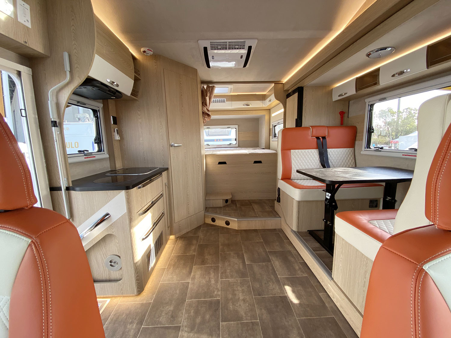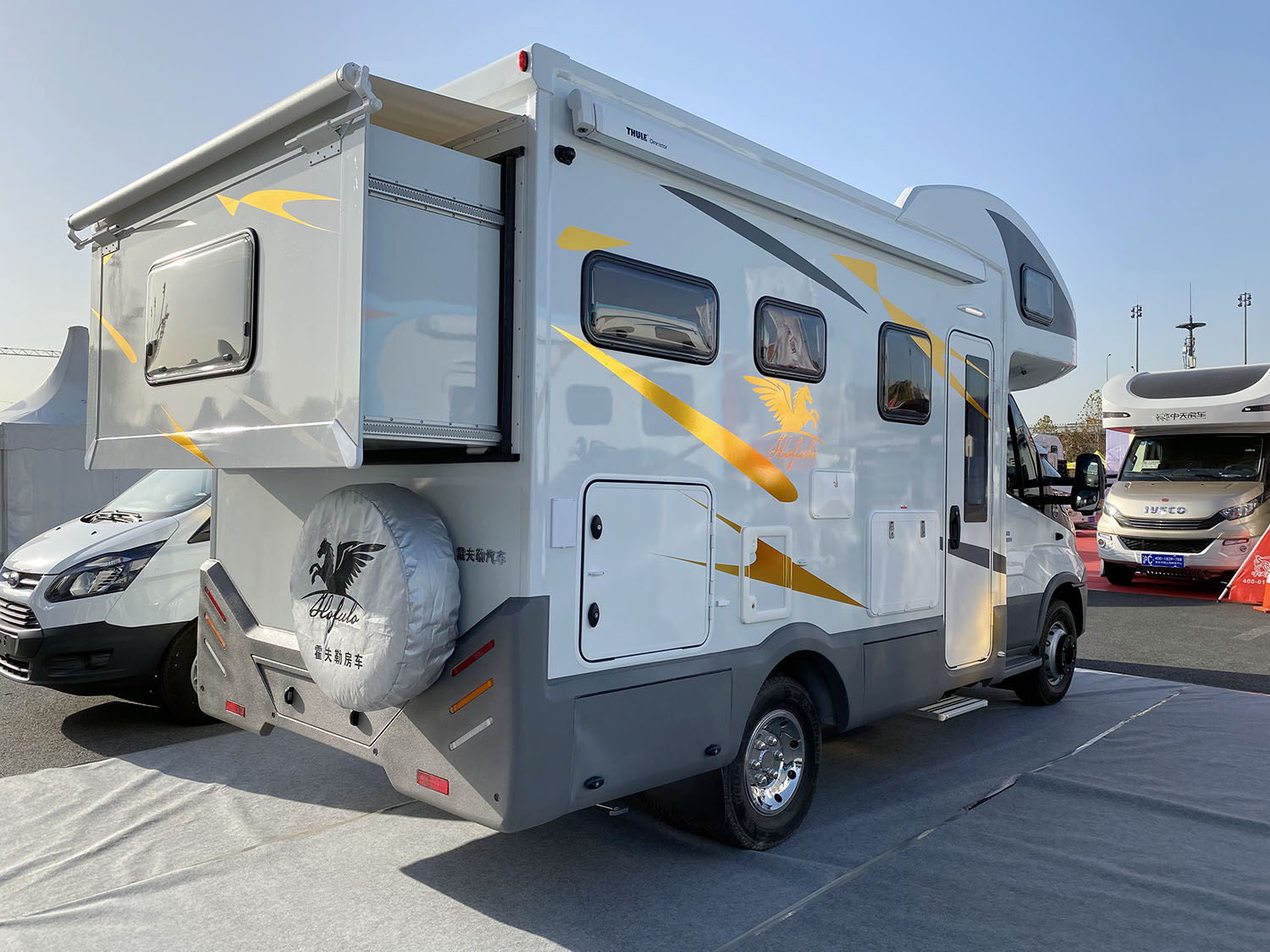 車身采用白色主色調搭配土豪金,高雅大氣,車身右側設置了遮陽蓬、抽拉式灶具、24寸外置液晶電視、儲物艙、電動踏步等眾多設施,車身左側后側為拓展艙。整車長寬高為5990×2370×3150mm。