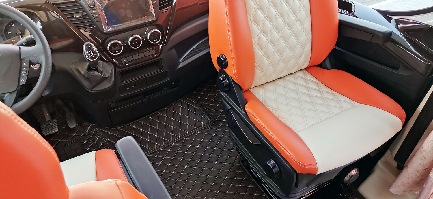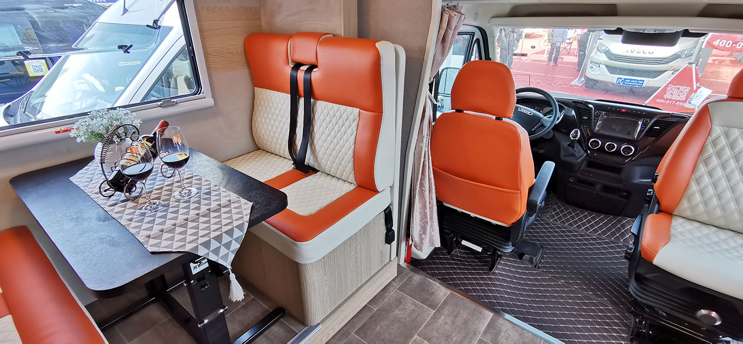 駕駛室兩個減震座椅可以向后旋轉,座椅采用白色+橘色搭配,給人溫暖的感覺。
