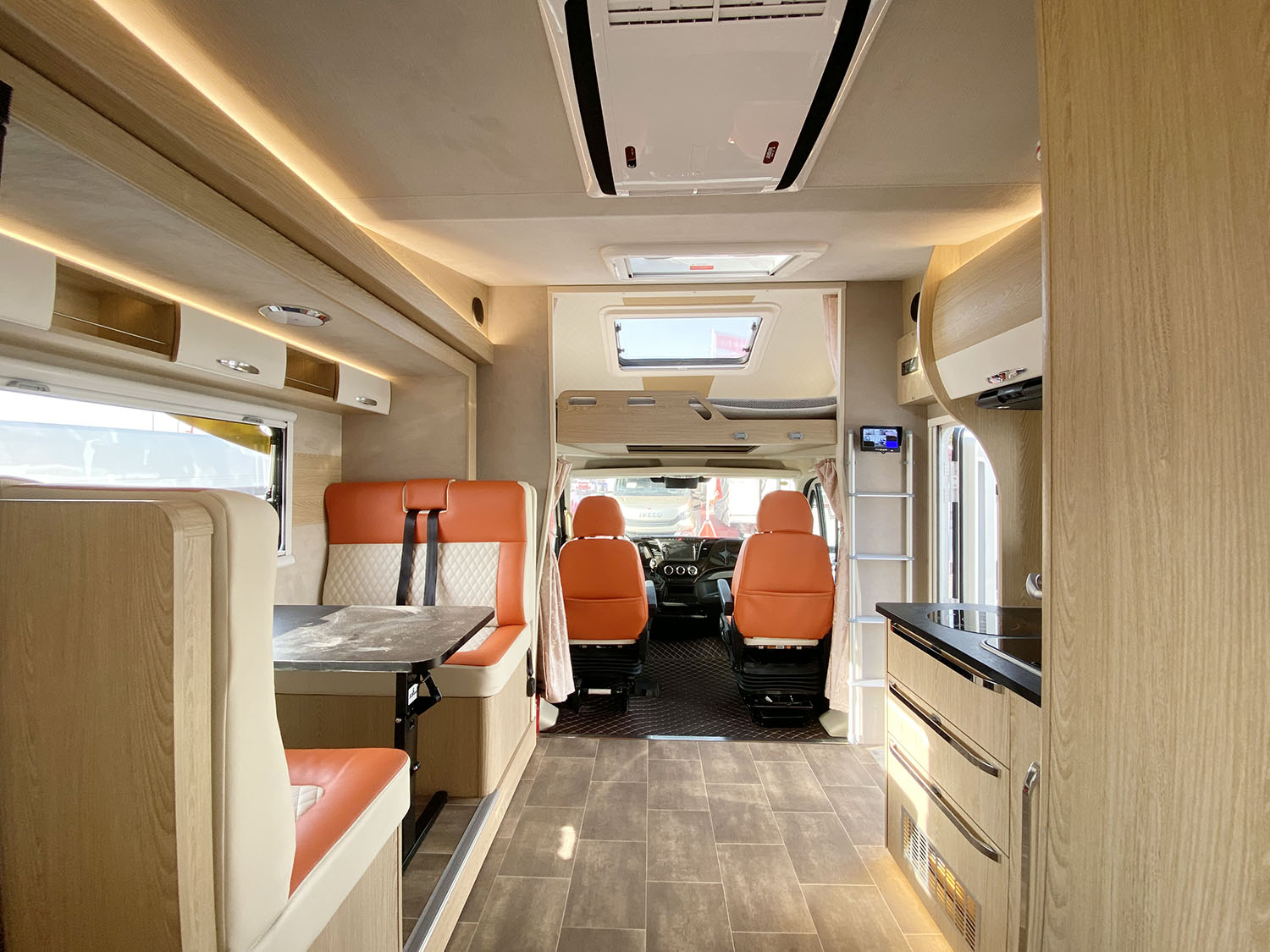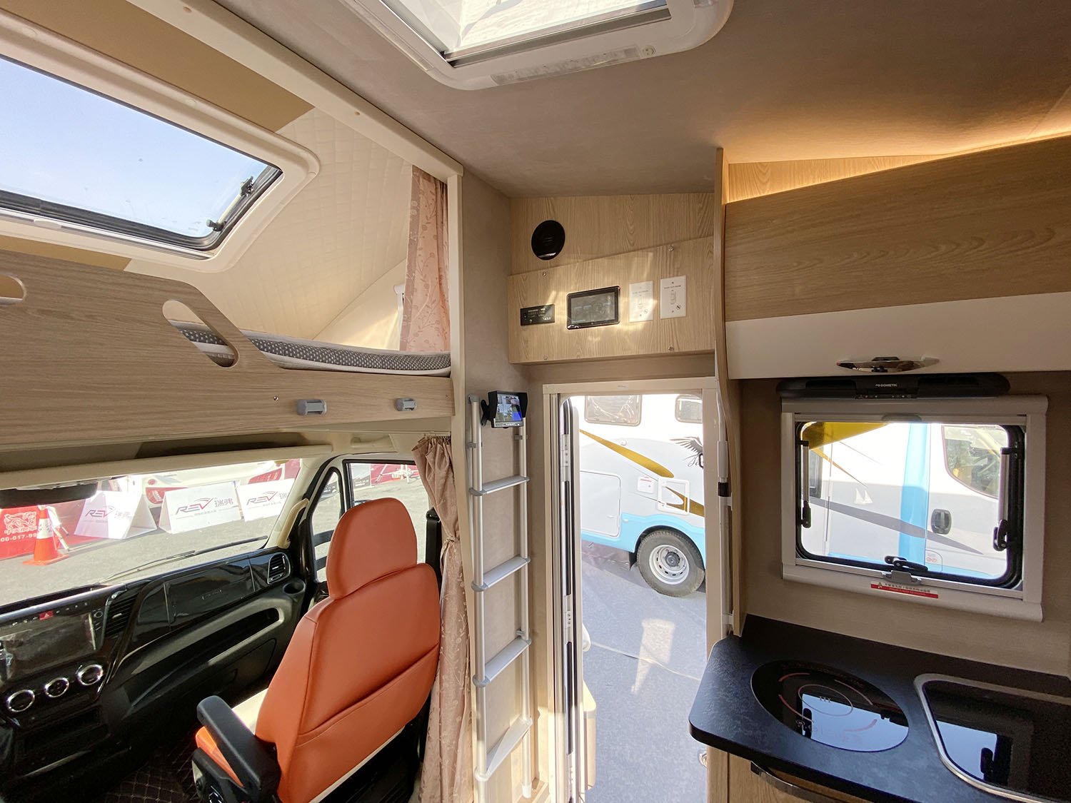 房車內整體空間很大,包含駕駛室及額頭床,雙人床向上翻轉后有一臺32寸液晶電視、卡座沙發(fā)、廚房區(qū)域,接連衛(wèi)生間,車尾處為雙人臥室。