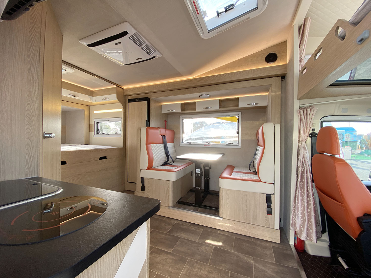 雙人對坐式卡座沙發(fā)設置在拓展艙內,連帶著卡座后方的塞特福德152L 車載冰箱,中部餐桌可以升降,休息時放下即可變成一個沙發(fā)床,睡2個孩子不成問題。