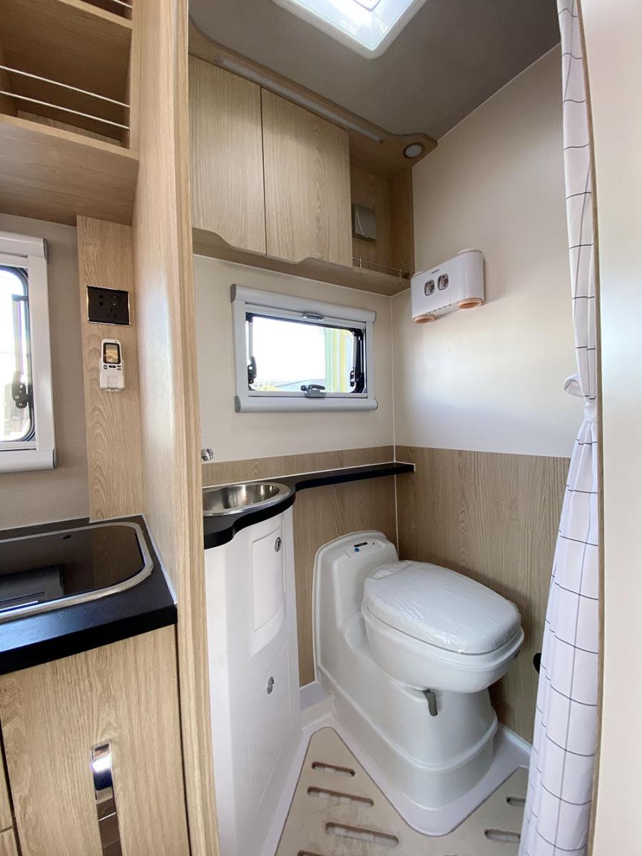 整體衛(wèi)生間設計在廚房邊上,儲物柜、馬桶,洗漱池、淋浴系統(tǒng)一應俱全,地板還做了干濕分離,非常方便實用。雙氣流換氣扇可以保障衛(wèi)生間內空氣的流通。在供水方面,車輛包含220L凈水箱,50L污水箱,此外還配備重力帶鎖加水口,可以適合不同環(huán)境下的加水需求。