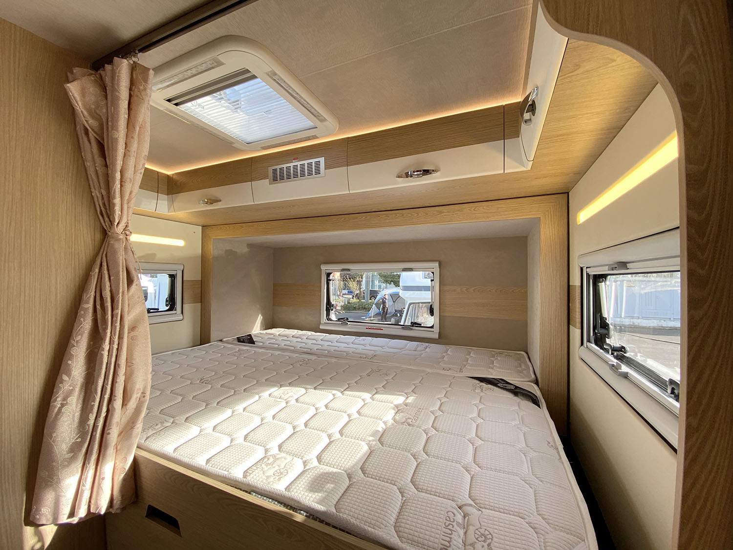 車尾的雙人床寬大舒適,床上方裝有儲物柜、夜燈與充電接口,非常方便實用。