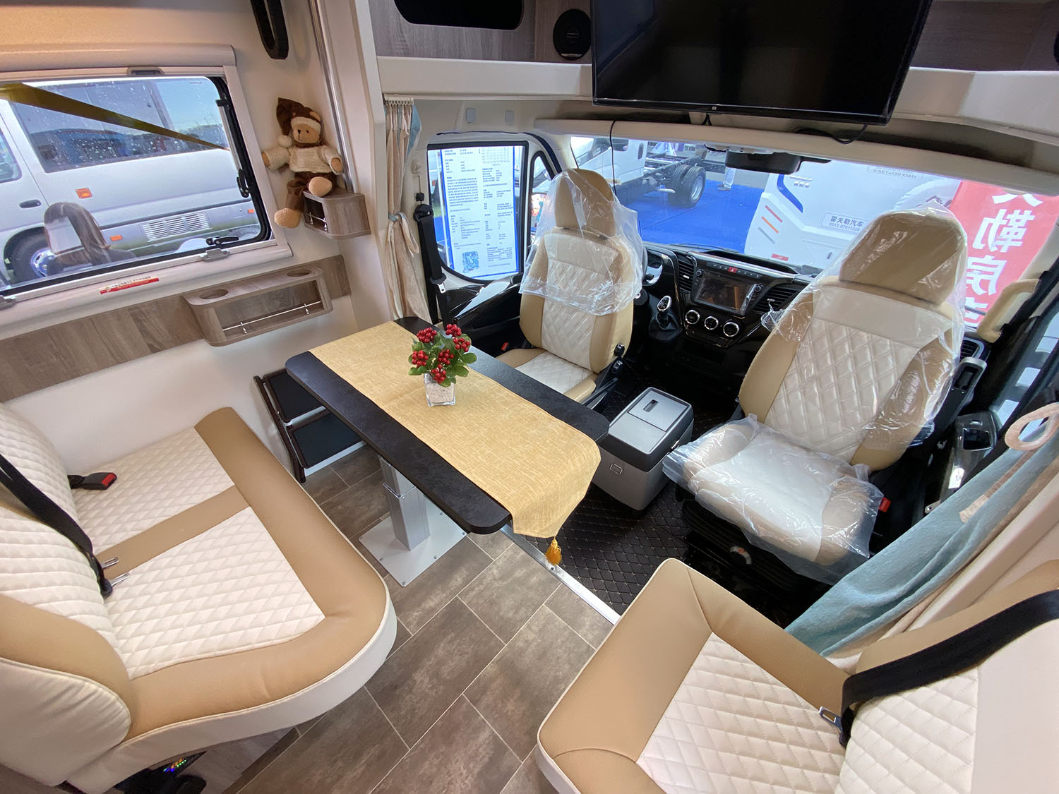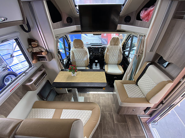 內(nèi)飾布局從前到后依次是駕駛室、會(huì)客區(qū)、電動(dòng)雙人吊床、廚房、衛(wèi)生間、后部雙人床。