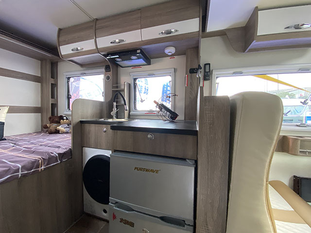 L型廚房設(shè)計(jì)在了卡座沙發(fā)和后部大床之間,儲(chǔ)物柜、儲(chǔ)物格、抽油煙機(jī)、帶USB口的多功能插座、洗菜池等配置齊全,廚房下方還裝了洗衣機(jī)和98L 車載冰箱,合理利用了空間。