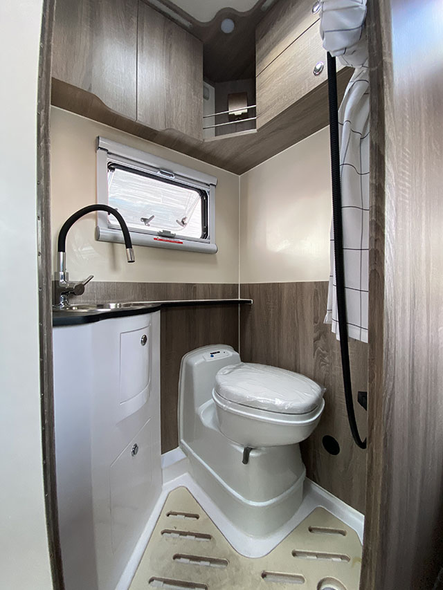 衛(wèi)生間設(shè)計(jì)在廚房對(duì)面,車門左側(cè),雙向換氣扇、儲(chǔ)物柜、儲(chǔ)物格、毛巾架、浴簾、梳妝鏡、房車專用馬桶等配置齊全,地板還做了干濕分離,方便實(shí)用。同時(shí)配備了220L凈水箱,50L污水箱,滿足日常生活所需。