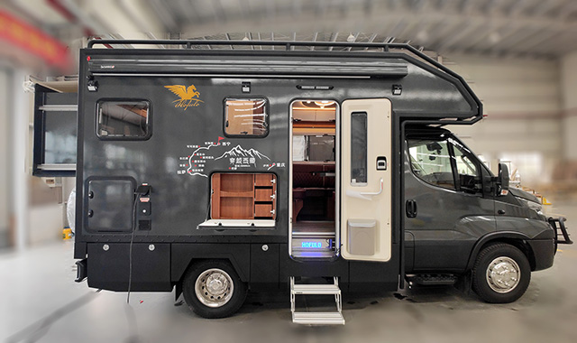 新車在外觀方面與霍夫勒黑金剛系列車型保持風格一致,三明治式復合車身結(jié)構(gòu),全鋁車身+全鋁裙邊,搭配高強度航空鋁板外墻板,保證車體的穩(wěn)固性和防腐性。車身外側(cè)配備了遮陽棚、儲物艙、水電接口、戶外噴頭、戶外廚房、戶外折疊板、5公斤燃氣罐艙、電動踏步、前雷達防撞系統(tǒng)、后拖車鉤等。