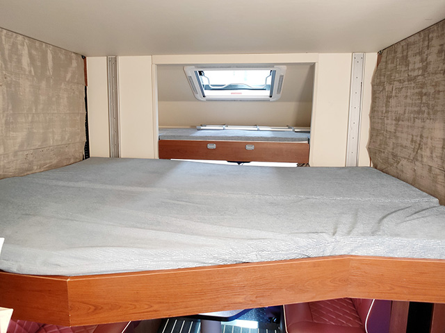 駕駛室上方是額頭床,可通過爬梯上下,頂部帶大尺寸天窗,保證車內(nèi)通風和采光。額頭床可以向上翻折,32寸液晶電視和音響設計在床底部。
