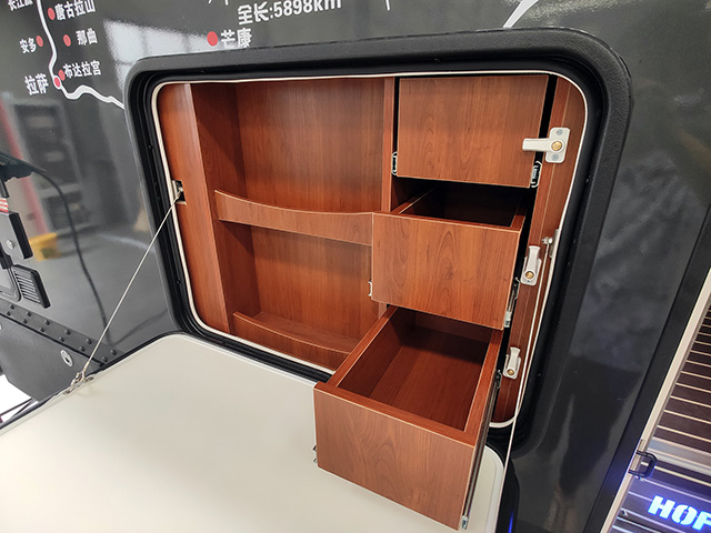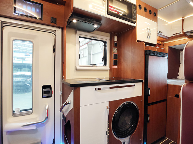 整體廚房設計在車門邊上,儲物柜、儲物格、微波爐、抽油煙機、電磁爐、帶蓋洗菜池等常用配置齊全。櫥柜下方還配置了一臺3公斤洗衣機,邊上的柜門打開后是雙向可抽拉儲物柜。緊挨廚房的是弗羅斯特148L車載冰箱和儲物柜。