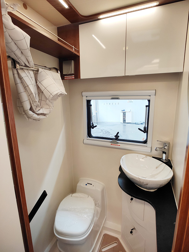 獨立衛(wèi)生間位于廚房對面、會客區(qū)后邊,地板做了干濕分離,排風扇、儲物柜、洗手臺盆、淋浴花灑、防水浴簾、房車專用坐便器、化妝鏡等配置齊全。
