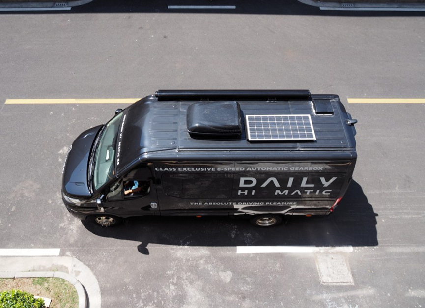 車身深邃的黑色金屬車漆在陽光的照耀下從不同角度反射出熠熠奪目的光亮,十分耀眼,整車的質(zhì)感非常好。同時車頂也配備了太陽能電池板。