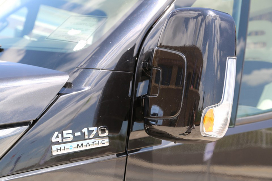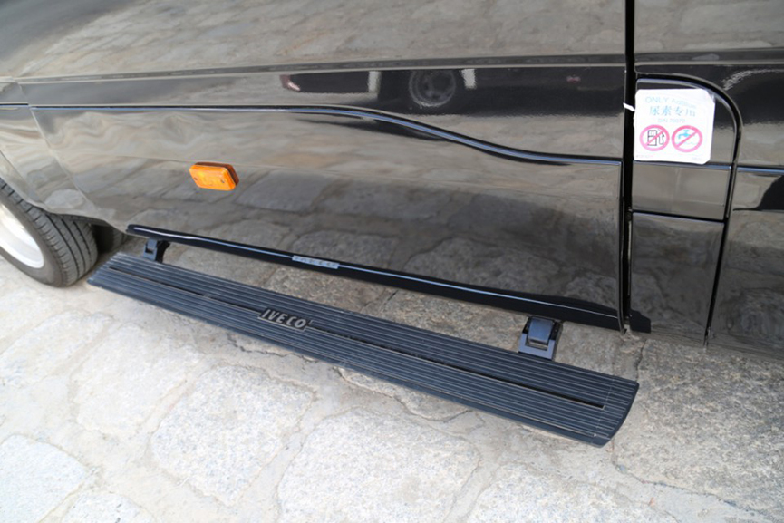 從外觀來看車身側(cè)面配備進口菲亞瑪手動遮陽棚,車身右側(cè)側(cè)滑電動乘客門,車門下方還配備了帶logo的電動迎賓踏板方便乘客上車。