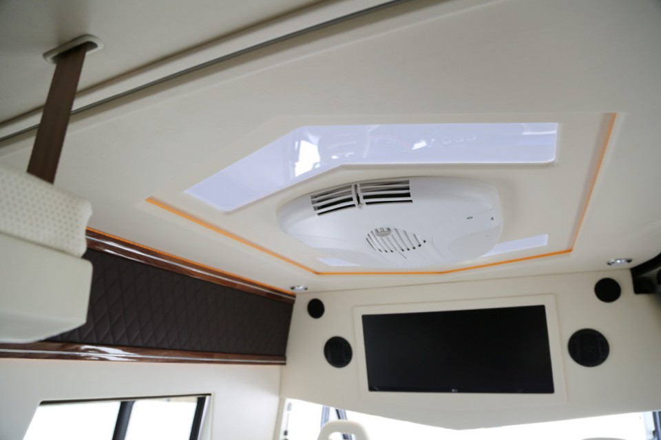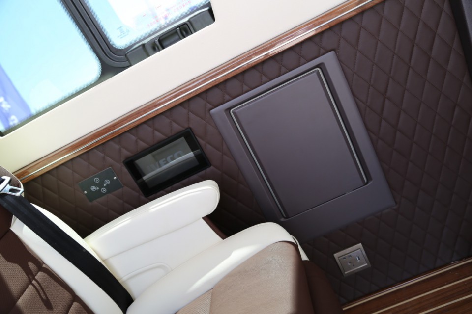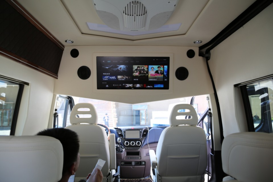 與商務(wù)座椅相互輝映的是車輛的娛樂系統(tǒng),駕駛室上方配備液晶電視并配套智能電視盒子,定制房車專用豪華音響,還可通過USB接口讀取媒體文件播放并支持上網(wǎng),車載電視的背景板也采用了進口超纖皮包裹。