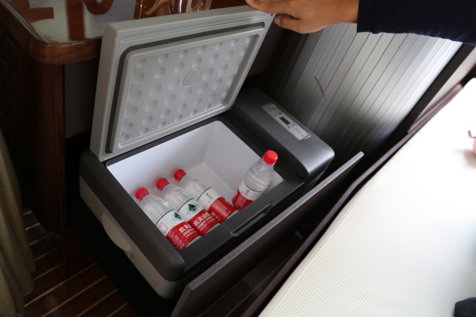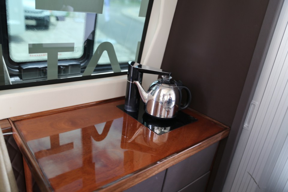 車廂中部為廚房區(qū),操作臺面非常平整,由于車款車側(cè)重于商務(wù)范兒,所以配備了燒水壺及下部抽拉式12L壓縮機冰箱。