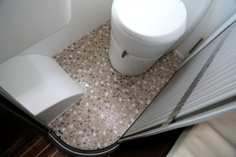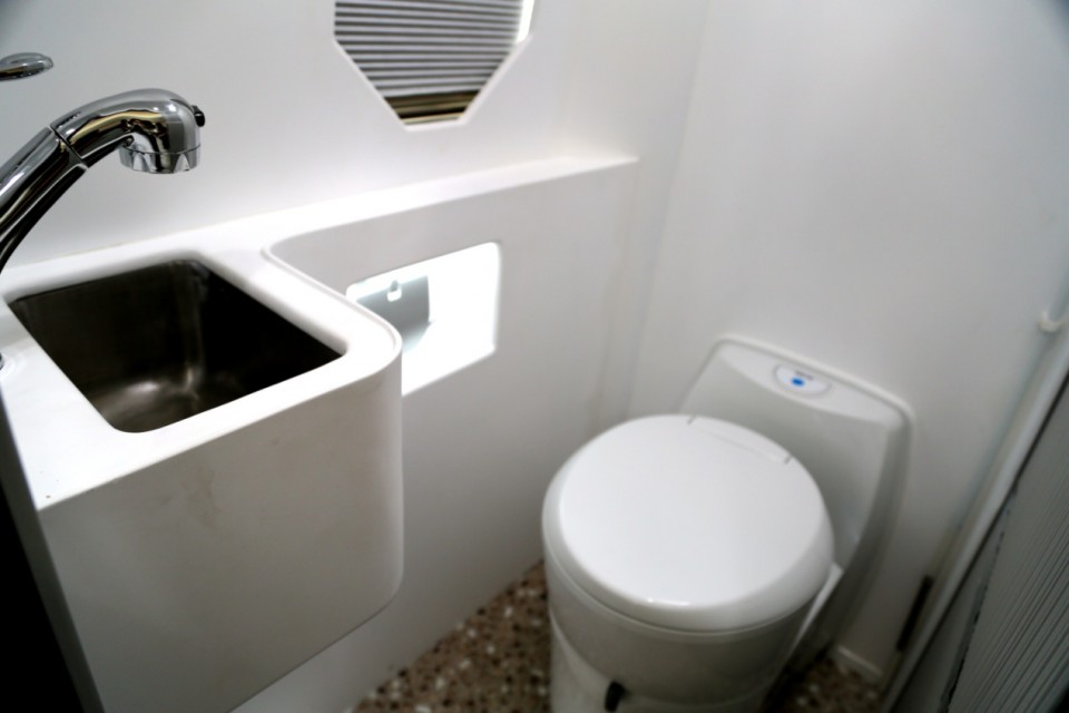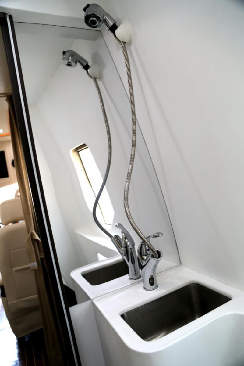 在車身的尾部配備有整體式衛(wèi)生間,衛(wèi)生間內(nèi)部空間相對較為緊湊,但勝在配置齊全,配備了固定式洗手池,進口電動游艇坐便器、玻璃鏡面 、防滑鵝卵石地板、衣架、掛鉤、卷紙架等。