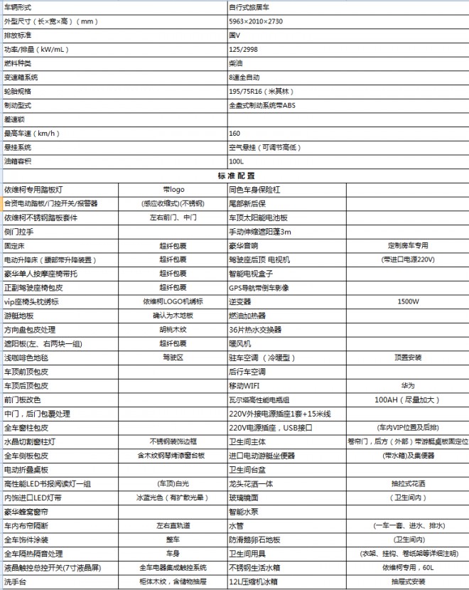 該車配備有車道偏離預(yù)警系統(tǒng)、后輪空氣懸掛系統(tǒng)、后輪差速鎖、四方位安全氣囊及匹配與瑪莎拉蒂同款的Hi-Matic 8速全自動變速箱;動力方面采用了F1C3.0T渦輪增壓柴油發(fā)動機,最大功率為125KW/170馬力,峰值扭矩400牛米,滿足國五(歐六)排放標準,最高車速可達160km/h, 100L大油箱。