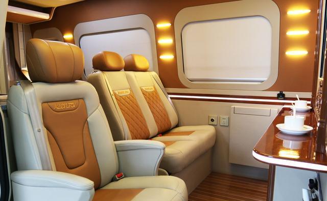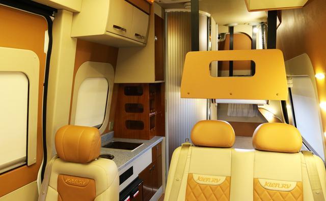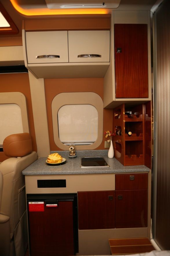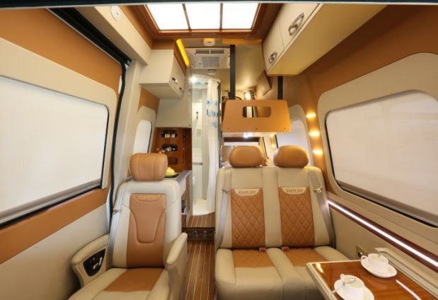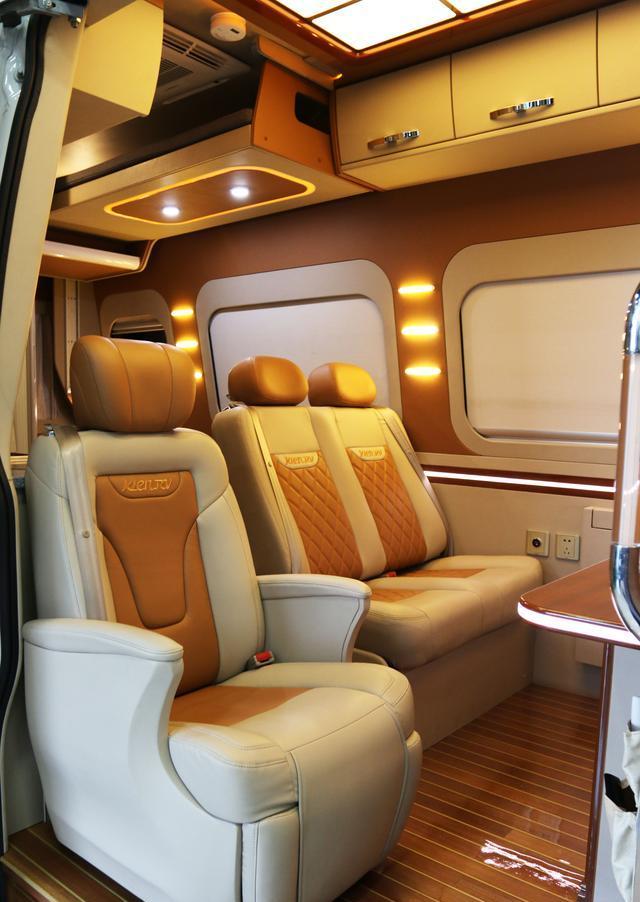 駕駛室與車廂后方為當下流行的前后貫通式結構,有兩種布局可選,一種是適用于高端商務用車的后卡座式布局,另外一種是適用于居家旅行的后縱置上下鋪布局。內飾均采用高檔柚木地板搭配皮質家具,盡顯高端品質。
