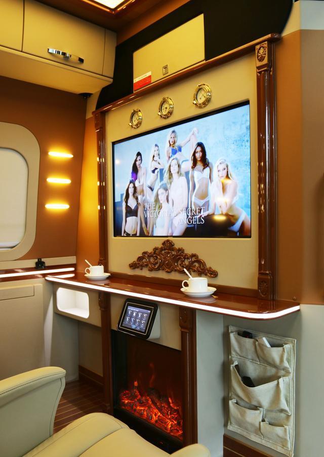 兩側都有很大的車窗,車前部的駕駛室后方采用了隔斷,40英寸可電動升降電視嵌在隔斷里,電視上面鑲嵌英倫風的時鐘和溫度、濕度表。電視下方壁爐的設計更是增添了歐式風格,盡顯高檔。
