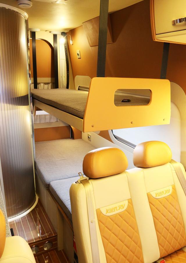 整車尾部休息區(qū),設置有一個縱置床和一個電動升降縱置床,可根據居住人數(shù)自由調整。床下方還帶有兩個燈,即使降下也不會擋住下床的燈光。