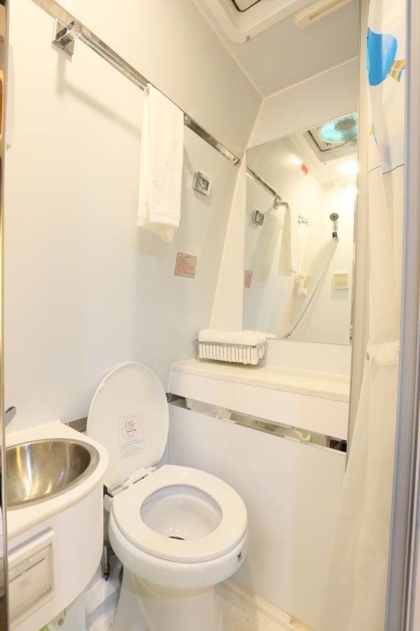 床旁邊為一體式衛(wèi)生間,配置有獨立面盆、一體式水龍頭淋浴花灑、電控粉碎式馬桶等,帶有110L凈水箱,90L污水箱。合理的格局規(guī)劃,齊全的功能配置,帶給你舒適的洗漱環(huán)境。