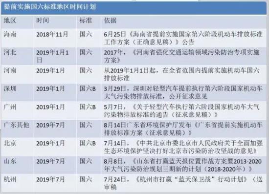 根據(jù)最新進(jìn)展,天津、河北、山西(重點(diǎn)區(qū)域)、杭州、山東、廣東(除深圳和廣州)也都將在2019年7月1日起實(shí)施國六標(biāo)準(zhǔn)排放。