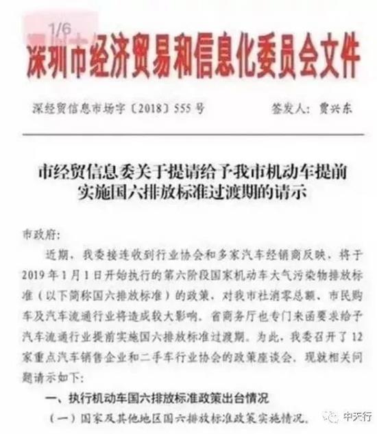 有媒體發(fā)出了一份“深圳市經(jīng)濟(jì)貿(mào)易和信息化委員會”關(guān)于申請“給予深圳市機(jī)動車提前實(shí)施‘國六’排放標(biāo)準(zhǔn)過渡期”的文件。文件指出實(shí)際執(zhí)行過程中將面臨“無車可賣”、“無車可買”的困境。因此,建議深圳市將機(jī)動車實(shí)施“國六”排放標(biāo)準(zhǔn)時(shí)間推遲至2019年7月1日,以給多方提供足夠的過渡期完成行業(yè)轉(zhuǎn)型。