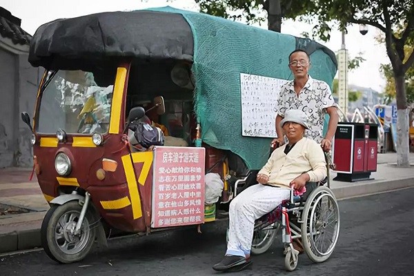 57歲的郭景新,是河南省封丘縣的農民。7年前,其妻趙嫦花突發(fā)腦出血,成為“植物人”。郭景新將三輪摩托改裝成“房車”,帶妻子到鄰縣扎針路上,發(fā)現妻子面部露出表情,加上發(fā)病前妻子也曾希望出去轉轉,郭景新決定帶妻子四處游玩。