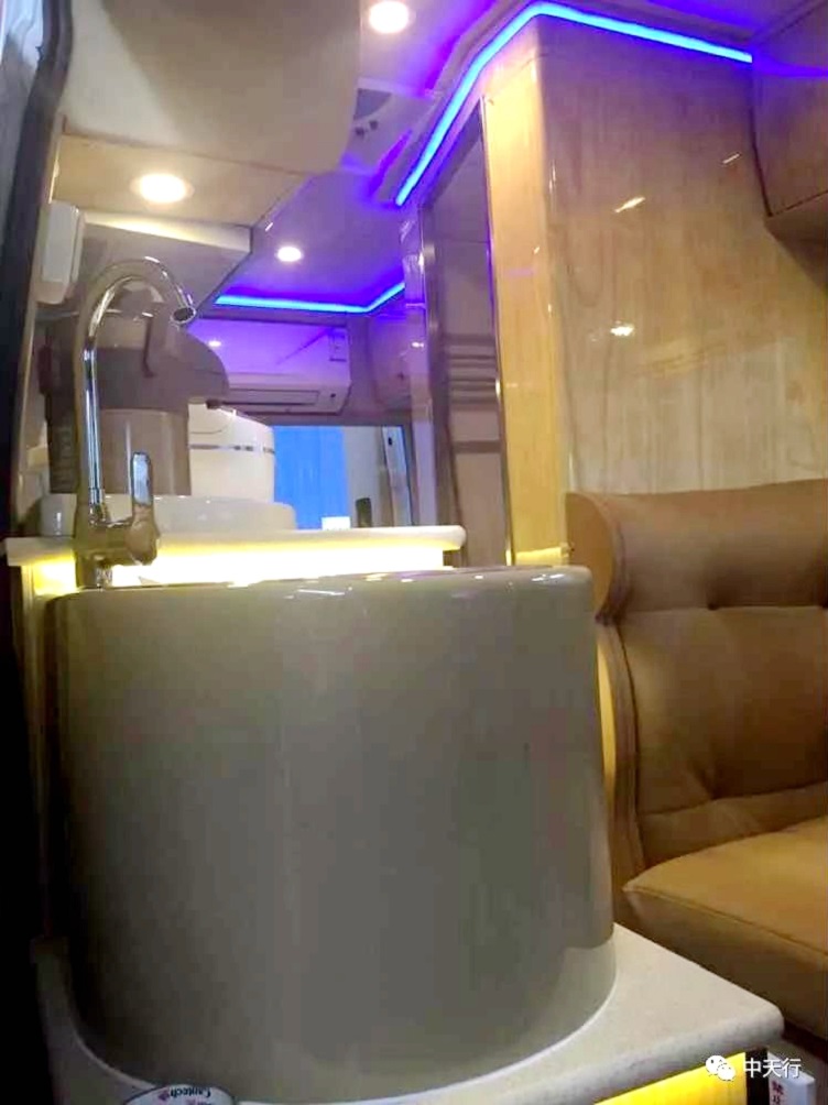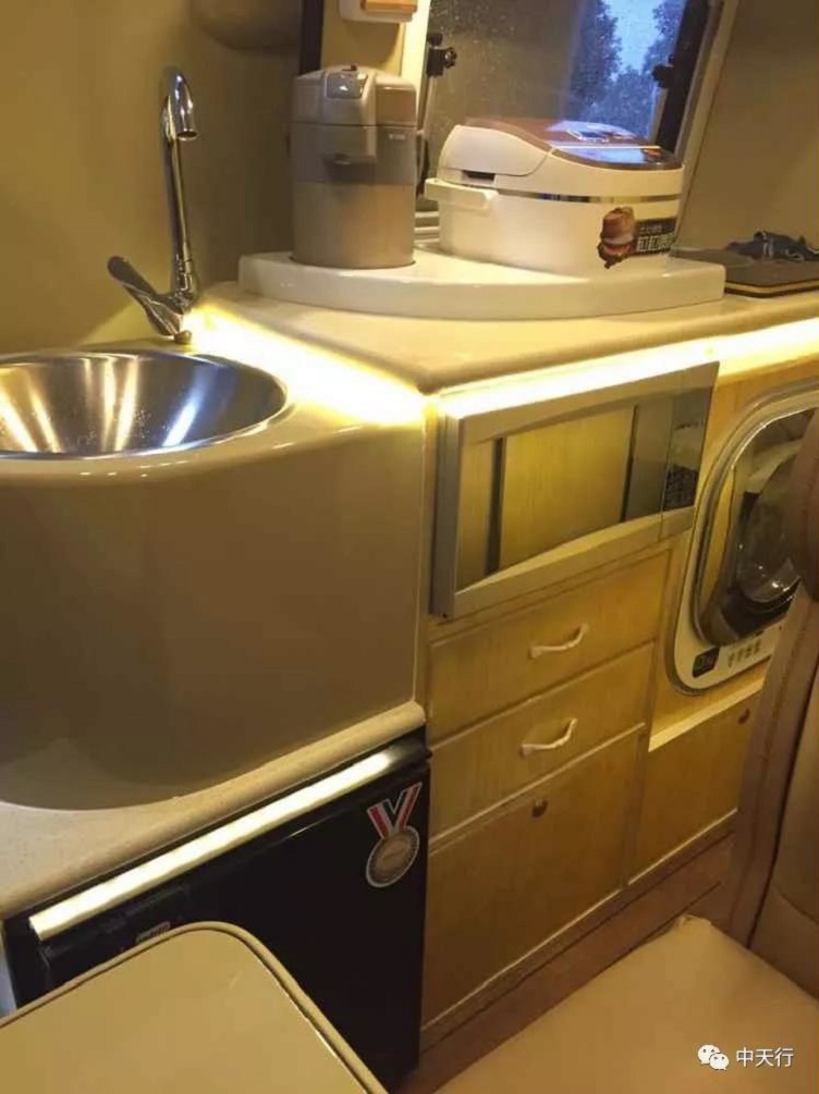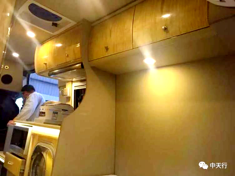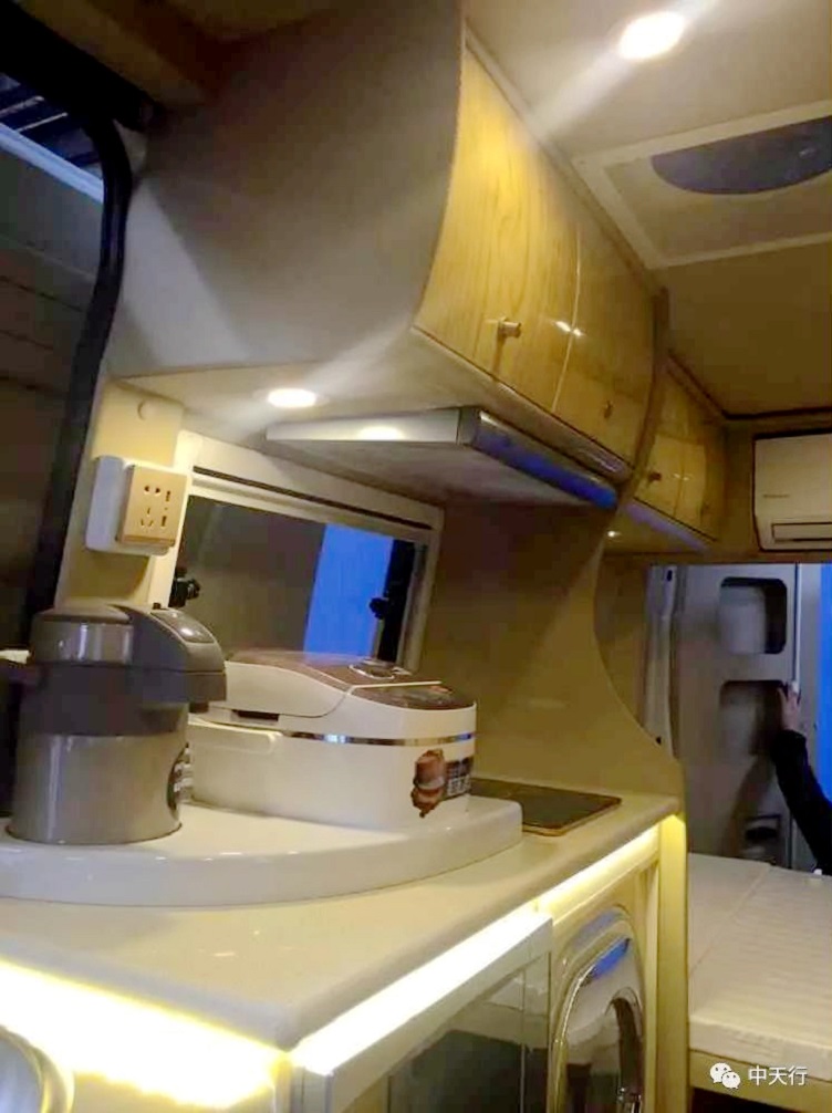 沙發(fā)對面為廚房區(qū)域,儲物柜、抽油煙機(jī)、帶USB口的五孔插座、電磁爐、電飯煲、微波爐、車載冰箱、車載洗衣機(jī)等廚房用品規(guī)劃布局合理,充分利用了空間。洗菜池設(shè)計(jì)的也很有特色,目前為止沒見過哪個B型房車上這么設(shè)計(jì)。衛(wèi)生間設(shè)計(jì)在沙發(fā)后邊,常規(guī)配置一應(yīng)俱全。