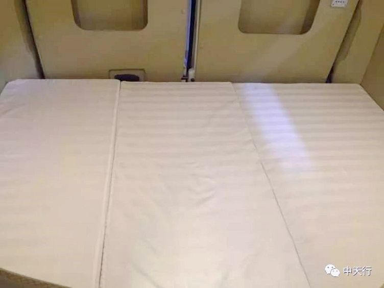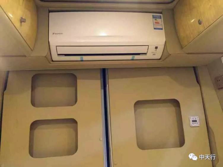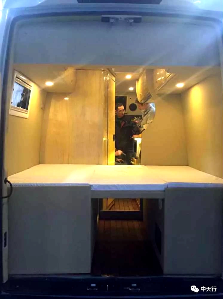車廂后方設(shè)計(jì)了超大雙人床,床上方安裝了家用空調(diào),床下留有儲物空間,打開后門后可取放物品。