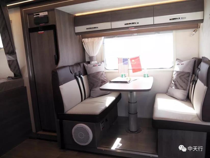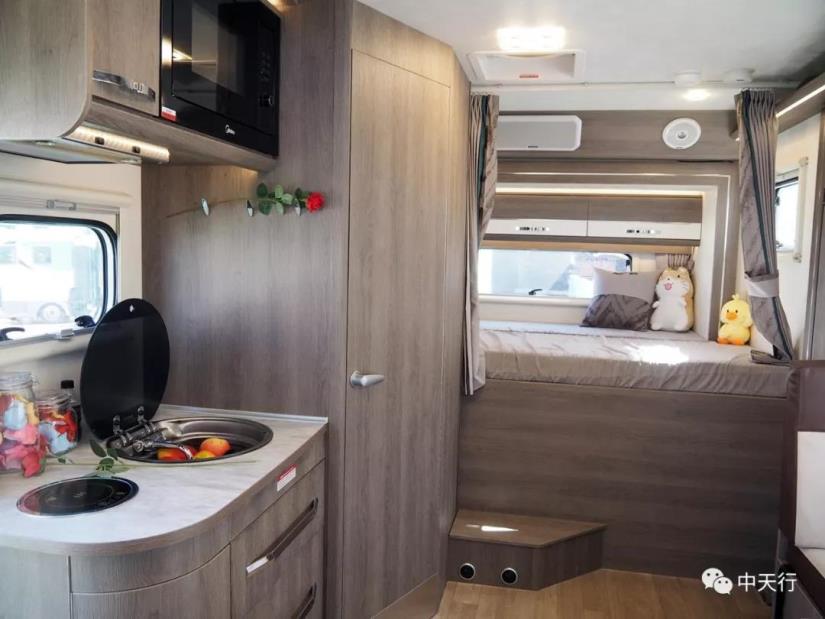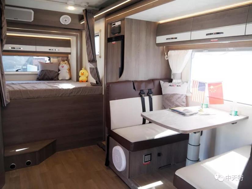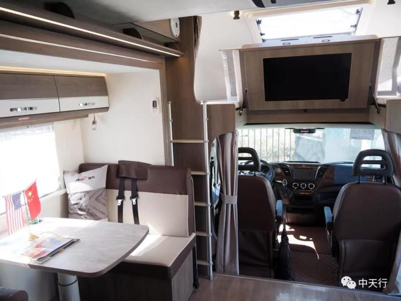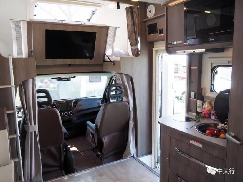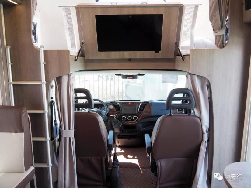 車內(nèi)整體布局從車頭到車尾依次為駕駛艙和車頂床鋪、客廳、廚房、衛(wèi)生間和臥室。駕駛室上方是雙人床,可借助爬梯上下,還配有全景天窗,增加了車內(nèi)采光;雙人床向上翻折后是32寸液晶電視,床鋪兩側(cè)和駕駛室與車廂連接處均設(shè)置了布藝窗簾,增加了私密性。
