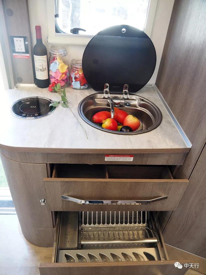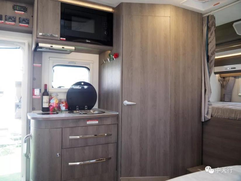 一體式廚房位于會客區(qū)對面,微波爐、抽油煙機、電磁爐、帶蓋水槽、儲物柜等配置齊全。乘客門的上方是該車的控制面板,采用的是物理按鍵,在這里可以控制整車的水路和電路系統(tǒng)。