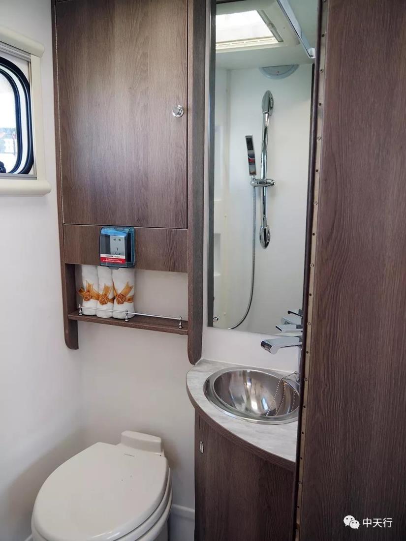 衛(wèi)生間設(shè)計在廚房邊上,進口電動粉碎式坐便器、洗臉盆、梳妝鏡、淋雨花灑、雙向排風(fēng)扇等配置質(zhì)量都非常好,帶有150L的凈水箱、80L的灰水箱和40L的黑水箱。